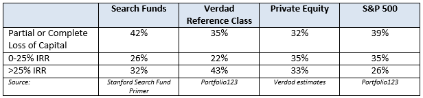 The difference in the return distributions is mostly that there are a higher percentage of big winners (>25% IRR investments). Investing is a hit driven industry, where stochastic positive outcomes drive the majority of excess returns. The 75th percentile of IRRs would be 35% for search funds, 38% for private equity, 50% for Verdad’s reference class, and only 26% for the S&P500.