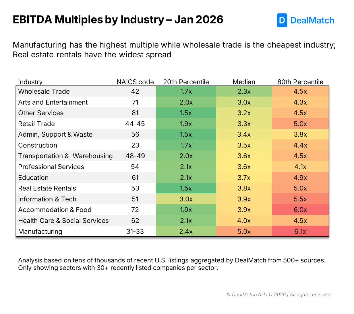 We've analyzed 100,000+ listings across our platform to show where multiples stand by sector - including the 20th and 80th percentiles so you can identify where deals might exist.