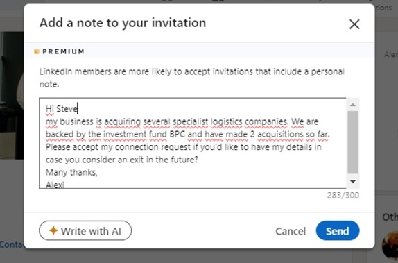 Sending Linkedin invites from a high quality profile with a semi-customised message has also generated a steady stream of leads. If you pay $50/month for a premium account you can send a large number of daily connection requests with a 300 character limit on the personalised message. About 1 in 4/5 are accepting my connection requests currently, after which I’m following up with more detailed information like a digital brochure. One discussion with a $1.5m EBITDA business which is fairly close to LOI at the moment came about from a Linkedin outreach.