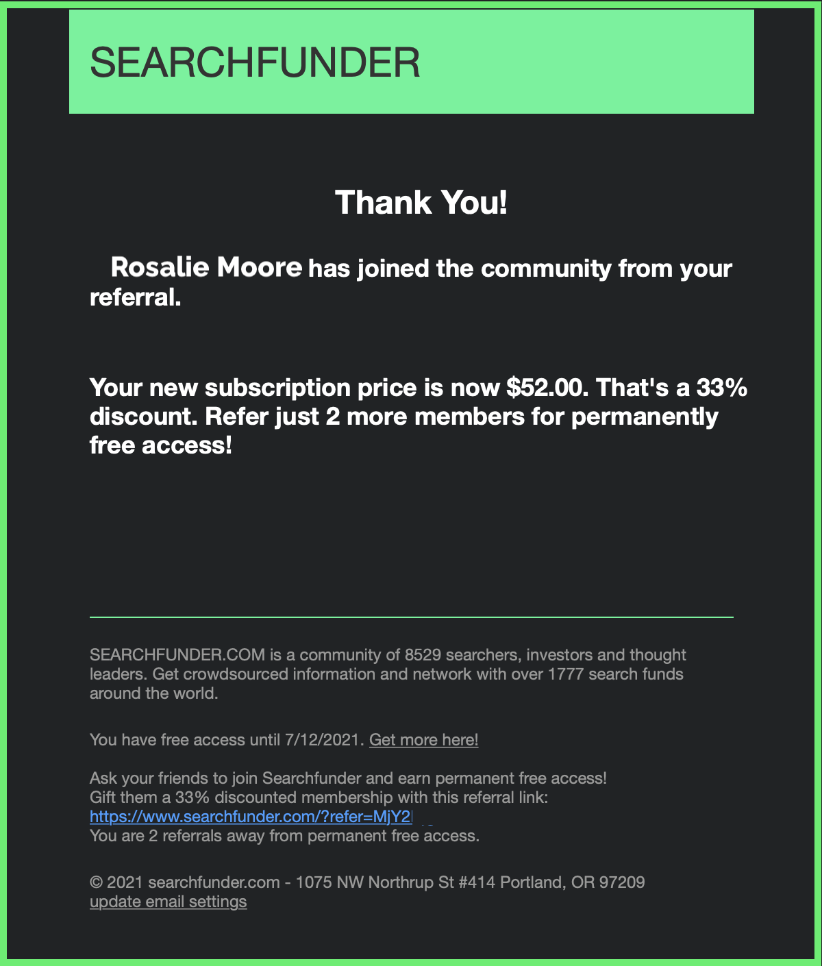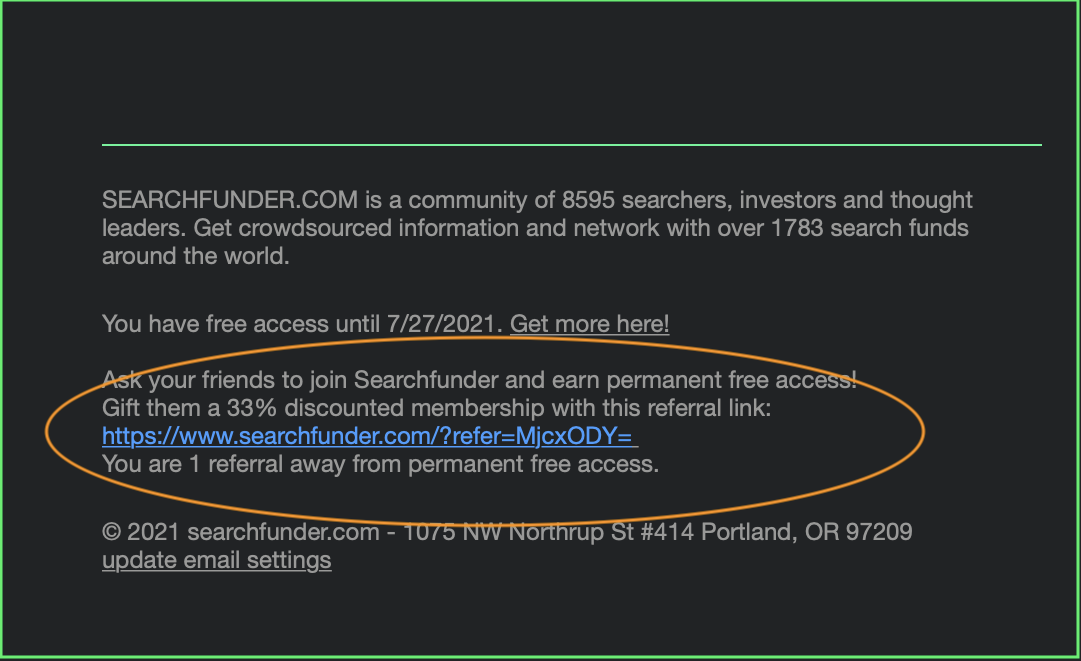 Check the bottom of an email you received from Searchfunder for your referral link or search your email box for https://www.searchfunder.com/?refer= to get the remainder of the link.