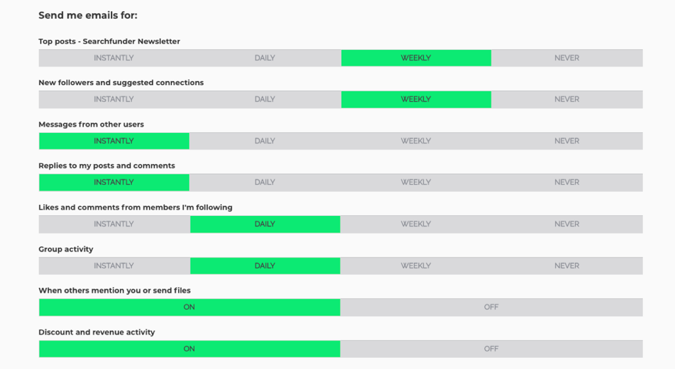 Our default email setting mean that most members receive at least one email per day from Searchfunder, perhaps 2 on occasion. These settings are based on feedback from our cost-conscious members who wanted regular reminders of the free access status of their account, which is appended to the bottom of nearly every email we send. It is also consistent with the practices of most news outlets and digital publishers. As your group membership and activity level increases, you may find you are receiving too many emails. You may adjust your email preferences at any time in two quick steps.
