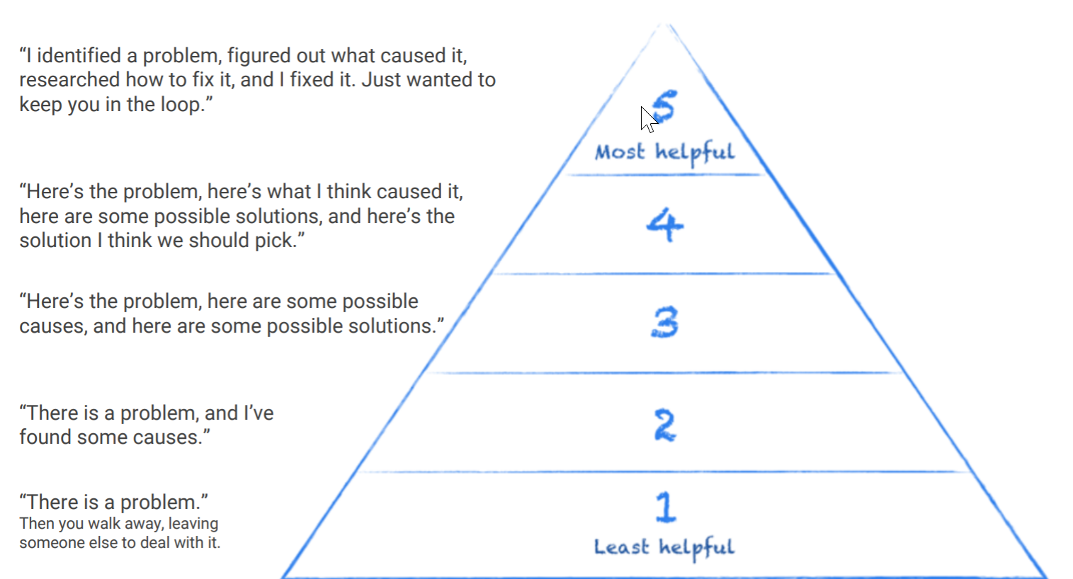 We like this framework because it provides tangible advice for employees about how to frame everyday tasks in a value-added manner. On this point, Debow outlines an example of how a mid-level employee might handle the onboarding of a big new account. A Level 1 employee would tell the boss she’s short-staffed for the project (we don’t have the people!) and walk away. A Level 2 employee would figure out why (nobody is recruiting for positions to support the new account). A Level 3 employee would suggest some solutions to fix the problem (put out a job posting). A Level 4 employee would identify solutions and have an actionable recommendation for what to do (here are the options, I think we should put postings on Indeed.com). A Level 5 employee would come to her boss having written and posted the jobs, take leadership for reviewing resumes, and tell the boss she will arrange for him to meet with viable candidates.
