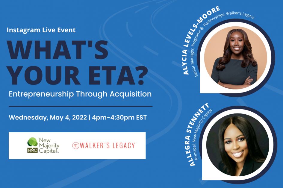 Join Walker's Legacy and New Majority Capital live on Instagram today for What's Your ETA? Entrepreneurship Through Acquisition. An opportunity to gain insight into what ETA is, how New Majority Capital can provide help in this space, and answering any questions you may have in real-time.