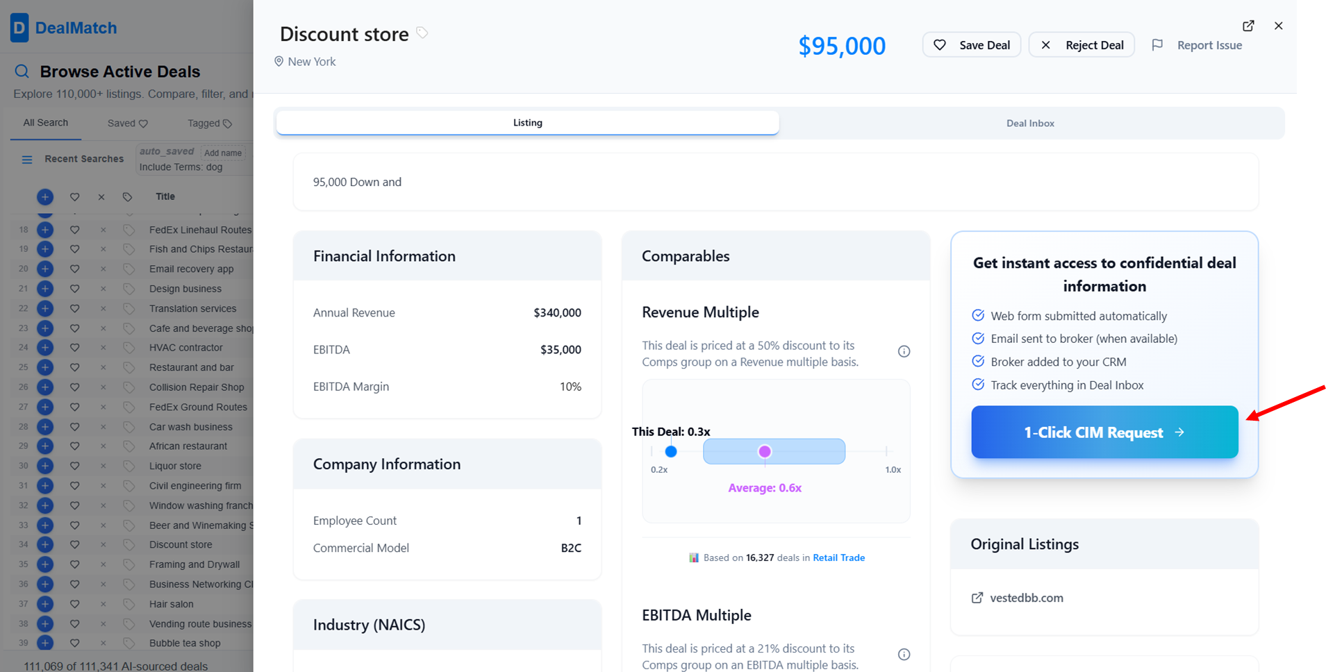 That’s why we built DealMatch: it aggregates on-market deals from thousands of brokers and lets you request CIMs in one click.